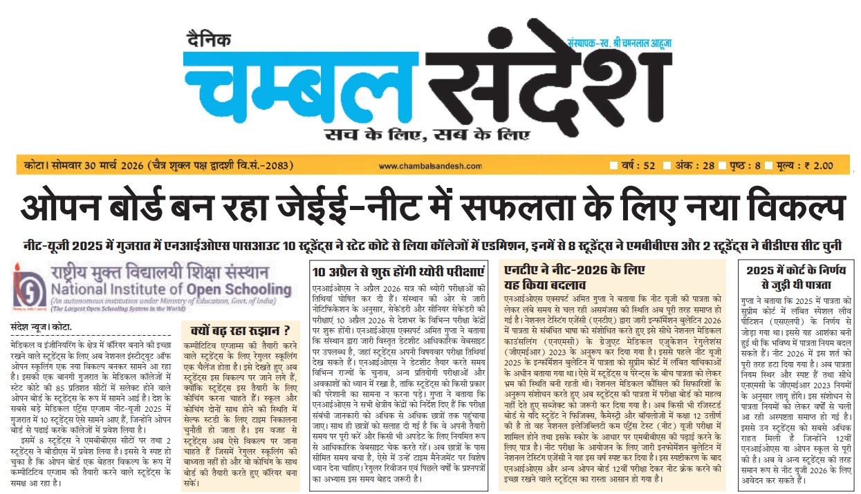 NIOS में दाखिले के मामले में दिल्ली-एनसीआर ने पूरे देश में पहला स्थान हासिल किया है। JEE, NEET और CLAT की तैयारी करने वाले छात्र अब बिना स्कूल गए, बिना अटेंडेंस के NIOS से 10वीं और 12वीं की पढ़ाई कर रहे हैं। NIOS एक ऐसा बोर्ड है जहाँ छात्रों को स्कूल जाने की ज़रूरत नहीं — साल में दो बार परीक्षा और सर्टिफिकेट राष्ट्रीय व अंतरराष्ट्रीय स्तर पर मान्य है यही वजह है कि दिल्ली-NCR के होनहार छात्र अब NIOS को अपनी पहली पसंद बना रहे हैं।
