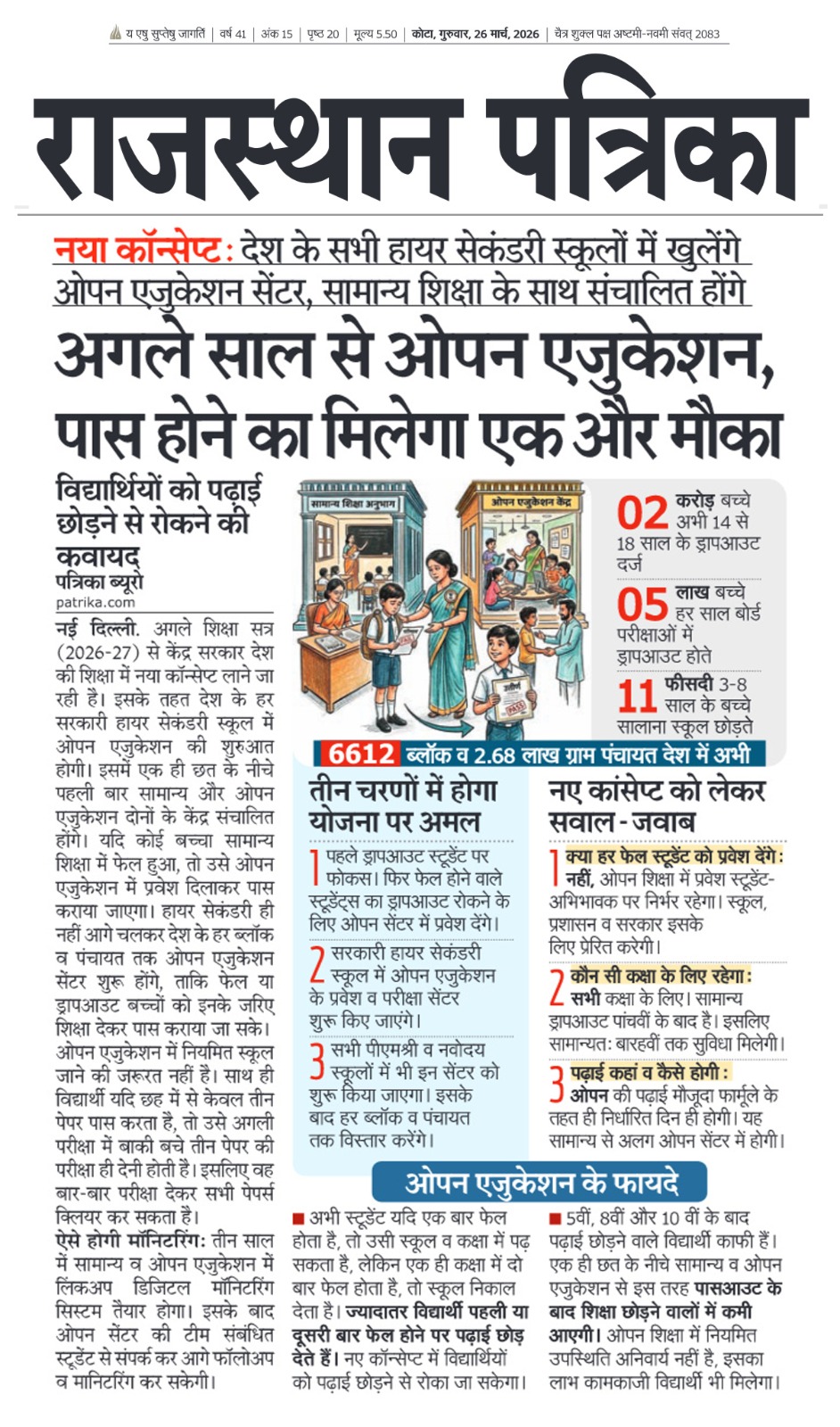 केंद्र सरकार 2026-27 से देशभर के हायर सेकेंडरी स्कूलों में ओपन एजुकेशन सेंटर शुरू करने जा रही है, जहां सामान्य शिक्षा के साथ ओपन स्कूलिंग भी उपलब्ध होगी। National Institute of Open Schooling (NIOS Board) जैसे सिस्टम के माध्यम से छात्र बिना नियमित उपस्थिति, फ्लेक्सिबल एग्जाम और सेल्फ-पेस्ड लर्निंग के साथ सेकेंडरी और सीनियर सेकेंडरी शिक्षा पूरी कर सकेंगे, जिससे ड्रॉपआउट और फेल छात्रों को दोबारा अवसर मिलेगा।